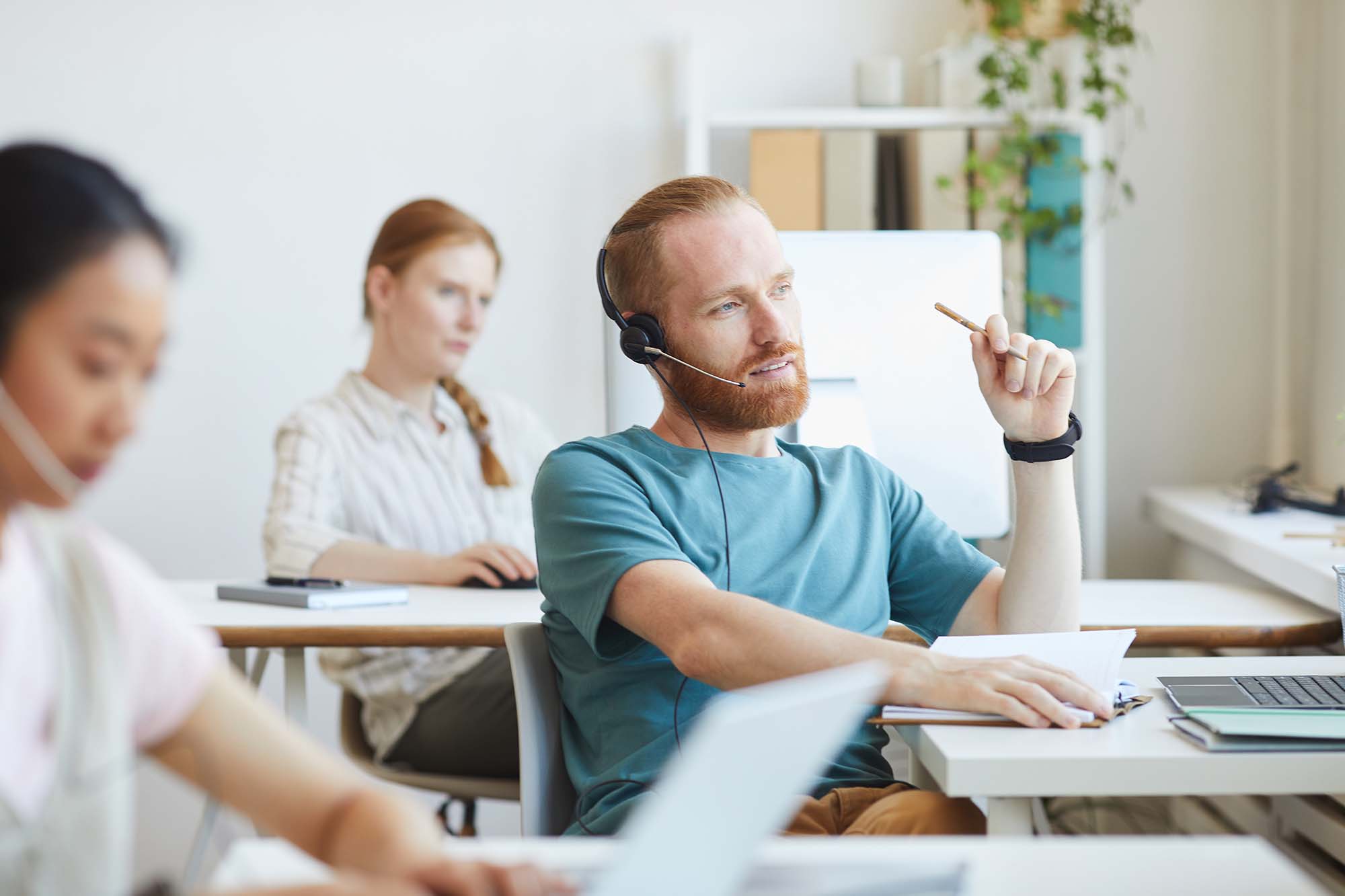 A group of call center employees working in an office, wearing headsets and focusing on their computers.