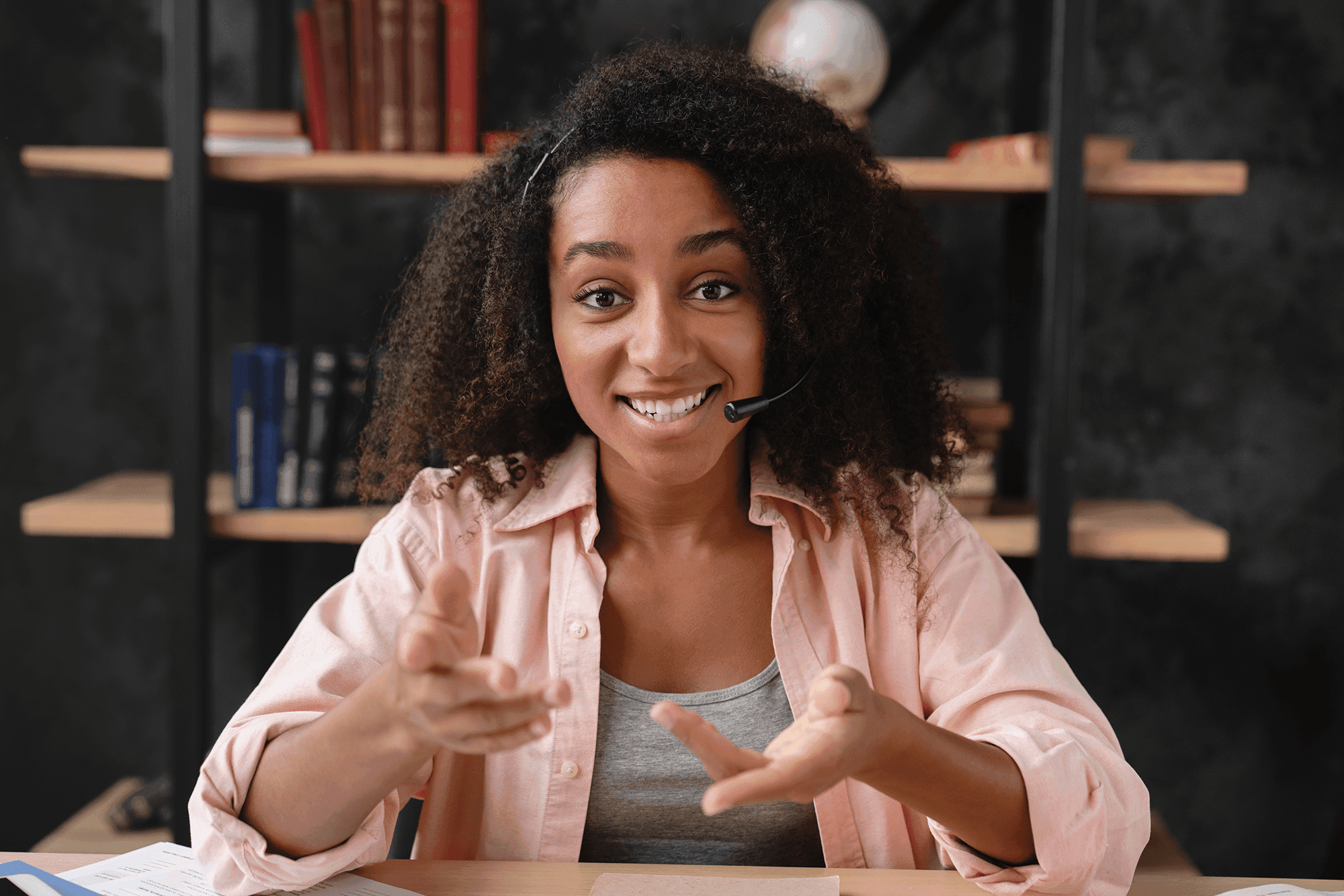 Woman with curly hair and glasses smiling at a desk with colleagues in the background.