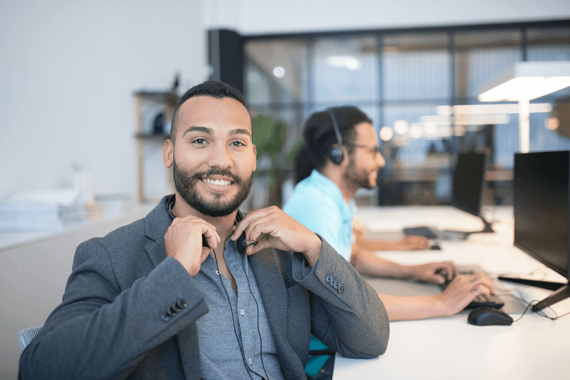 A man with a beard and glasses wearing a grey suit and blue tie, is working on a laptop.